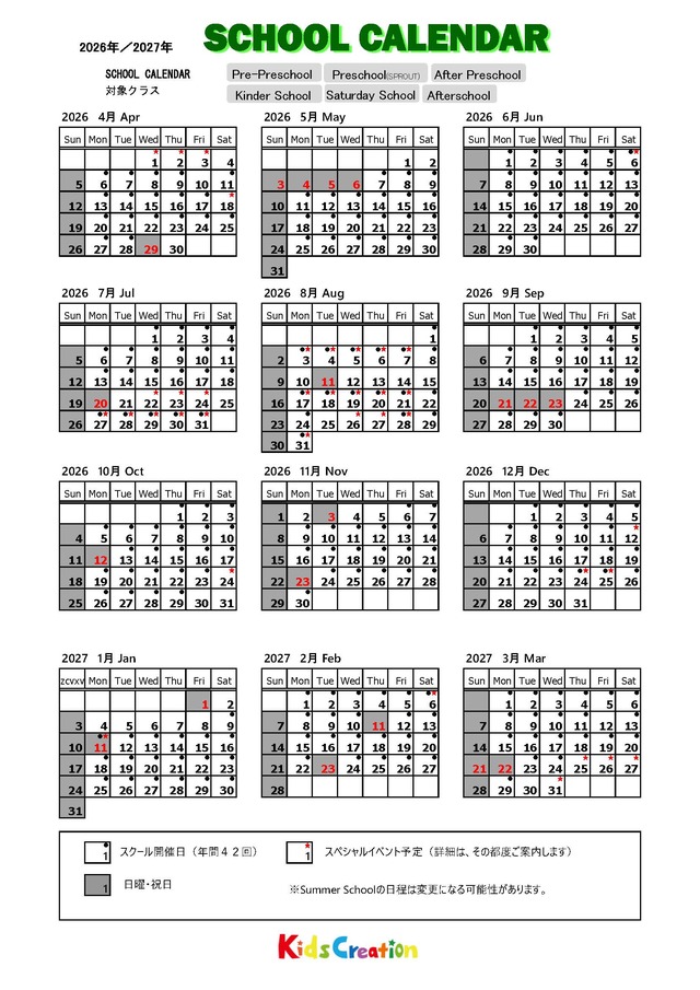 年間スケジュール: スクールカレンダー2026-2027NEW