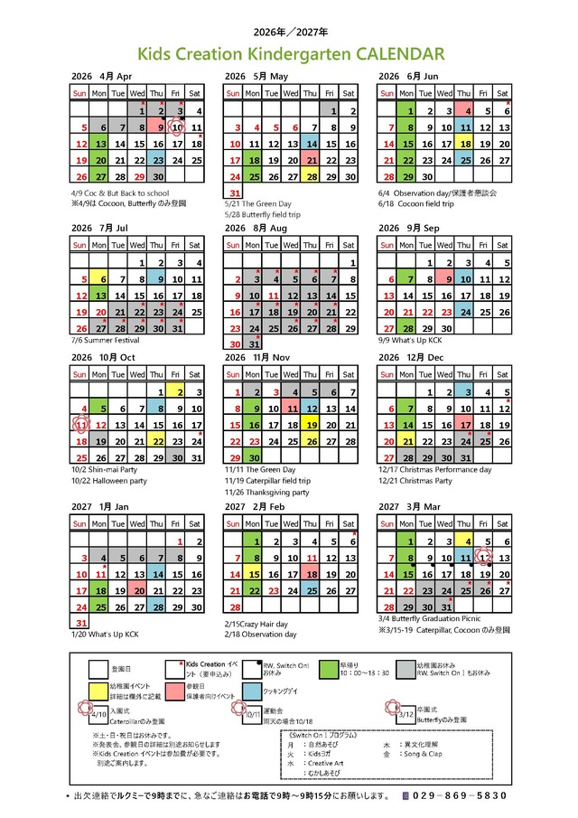 年間スケジュール: 幼稚園カレンダー2026-2027NEW